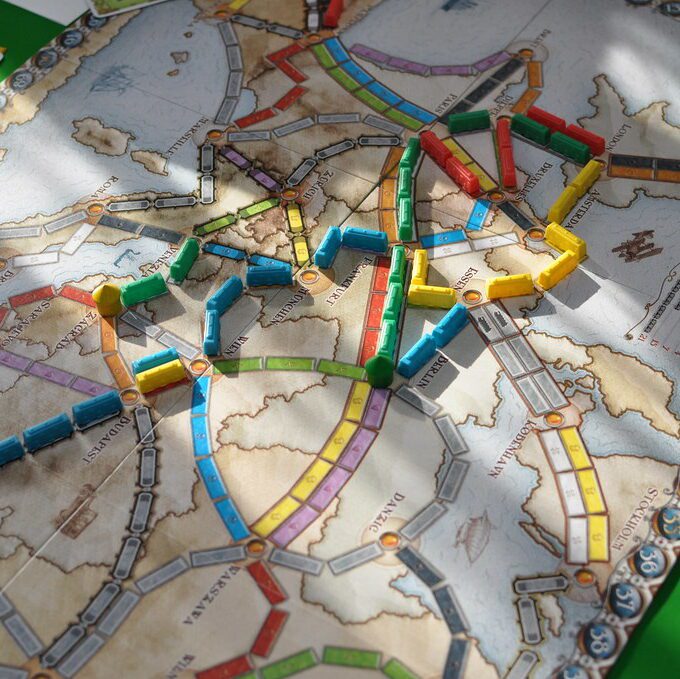 Qui ne possède pas à la maison un exemplaire des Aventuriers du Rail dans sa ludothèque ? Cette création d’Alan R. Moon est divinement illustrée par Julien Delval et Cyrille Daujean. Depuis sa première parution en 2004 aux éditions Days of Wonder, le jeu est devenu un best-seller vendu dans le monde entier. L’univers illustré se décline sur toutes les extensions. Chaque plateau se compose d’une immense carte reprenant les codes graphiques vintage des planisphères topographiques du XIXème siècle.
