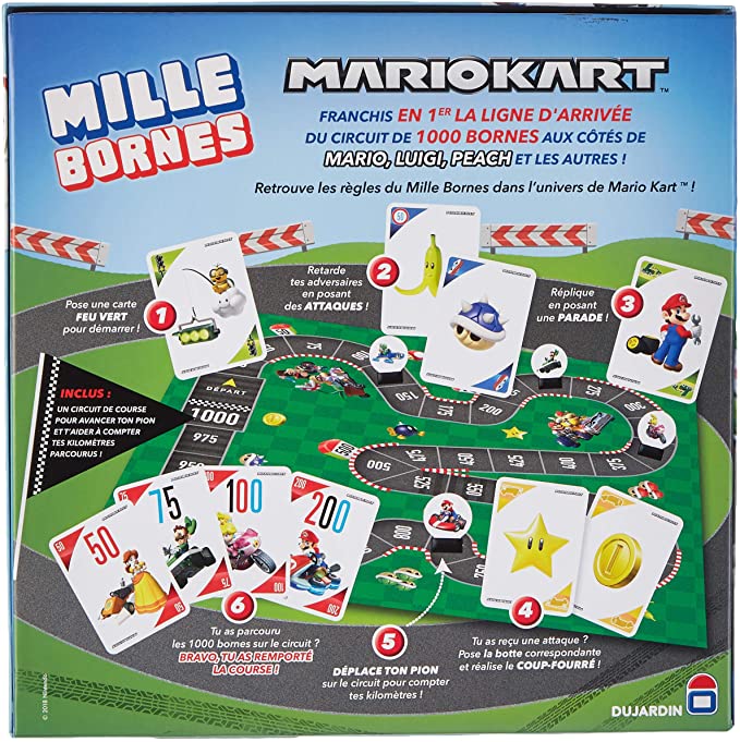 Bon, et pour finir sur une note plus légère, il y a aussi le Mario Kart qui a été adapté sur le jeu Mille Bornes avec un format de jeu de plateau et pas seulement de cartes.