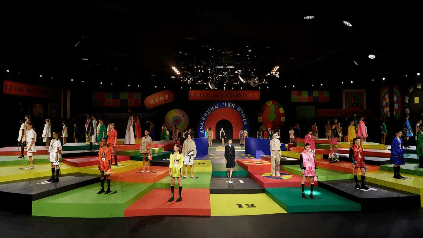 La scénographie du défilé Dior prêt-à-porter printemps-été 2022 rend hommage à l’artiste Anna Paparatti, figure emblématique de l’art italien des années 60 sous la forme d’un plateau de jeu de l’oie.