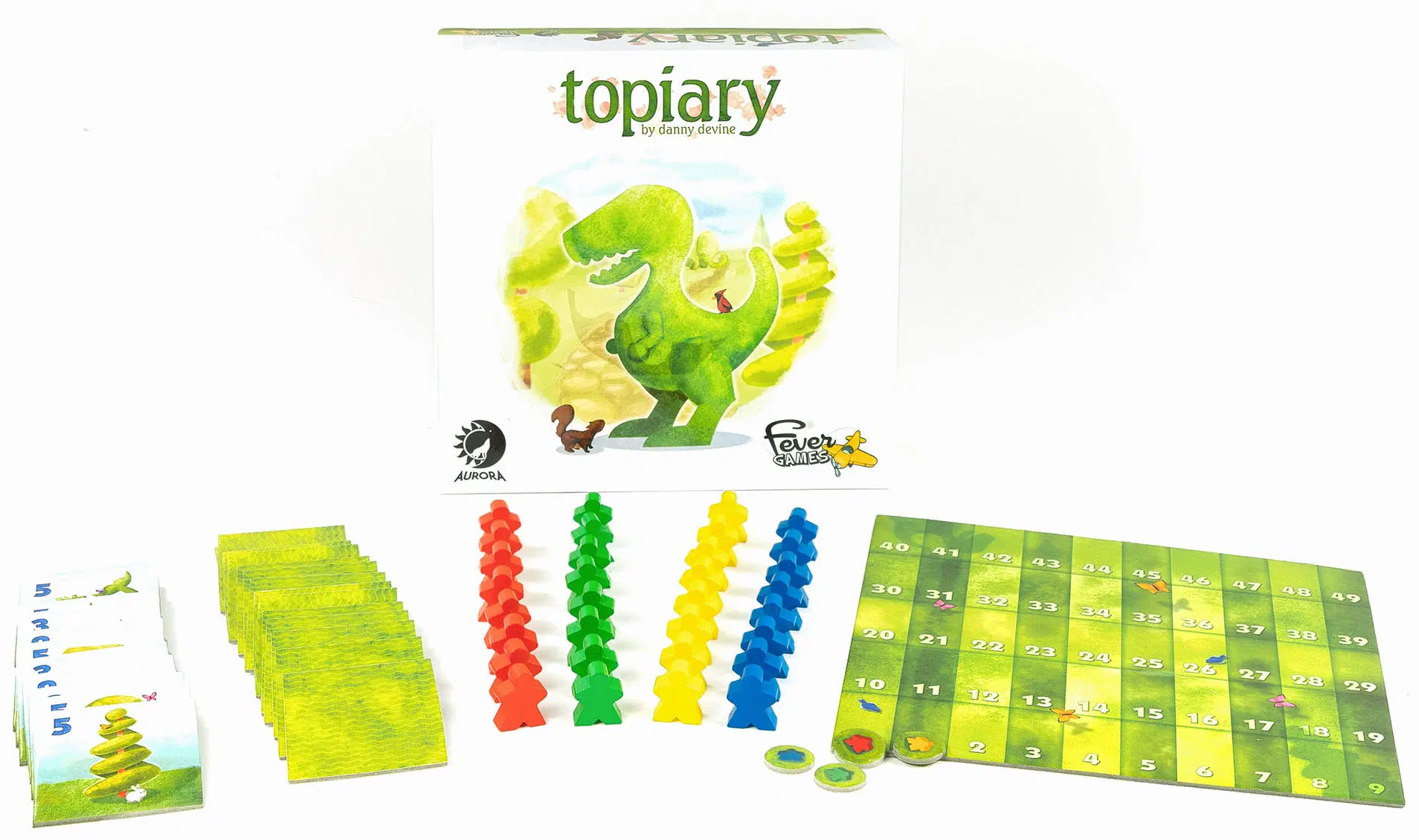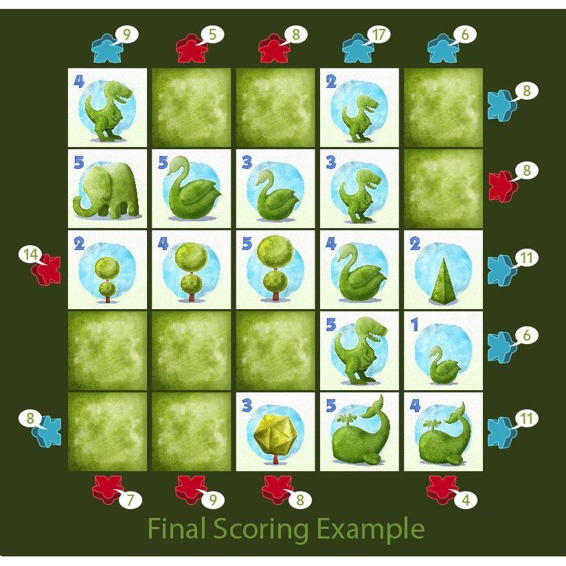 - 40 tuiles topiaires avec une valeur de 1 à 5 et représentant différents types d’arbres (dinosaures, baleines…)