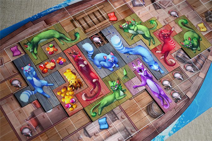 Chaque chat a une forme unique (polyominos) et une couleur et doit être placé intelligemment pour marquer un maximum de points. Il faut regrouper les chats par couleurs mais aussi remplir les différentes pièces de ton bateau sans laisser de trous, recouvrir les rats, chopper des trésors et également veiller à respecter les traditions : ces missions que tu vas piocher et qui vont s’accumuler au fur et à mesure de la partie, te donnant différentes manières de scorer des points.
