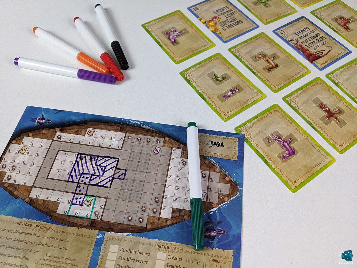 Au lieu de placer une tuile, on doit dessiner la forme du chat sur notre bateau avec un feutre de la couleur de celui-ci, c’est un peu moins plaisant que de manipuler une tuile de chat mais ça a l’avantage d’être bien plus rapide ! Même s’il n’y a pas tant de temps morts dans la version classique de L’île des chats, ici c’est encore plus dynamique. Les parties font max 1 heure et se terminent souvent en 30 min. Les fiches bateaux ne sont pas en papier mais en ardoise et donc le jeu est réutilisable à l’infini.